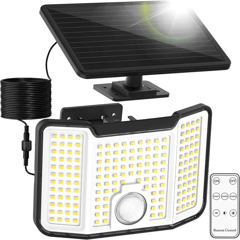JMK-2303 is a high-performance solar powered human body induction lamp designed for safe lighting in areas such as courtyards, porches, and garages. It adopts the latest fifth generation CdTe solar technology, which can efficiently charge even on rainy days. Equipped with 171 ultra bright LED chips, it can provide a dazzling brightness of up to 2000 lumens. Its innovative solar panel and lamp body detachable design allows you to install the solar panel in the optimal lighting position, ensuring charging efficiency. Equipped with upgraded digital infrared sensors, the detection range is longer and more accurate. It lights up when people come and gradually turns off when people leave, and is intelligent and energy-saving.